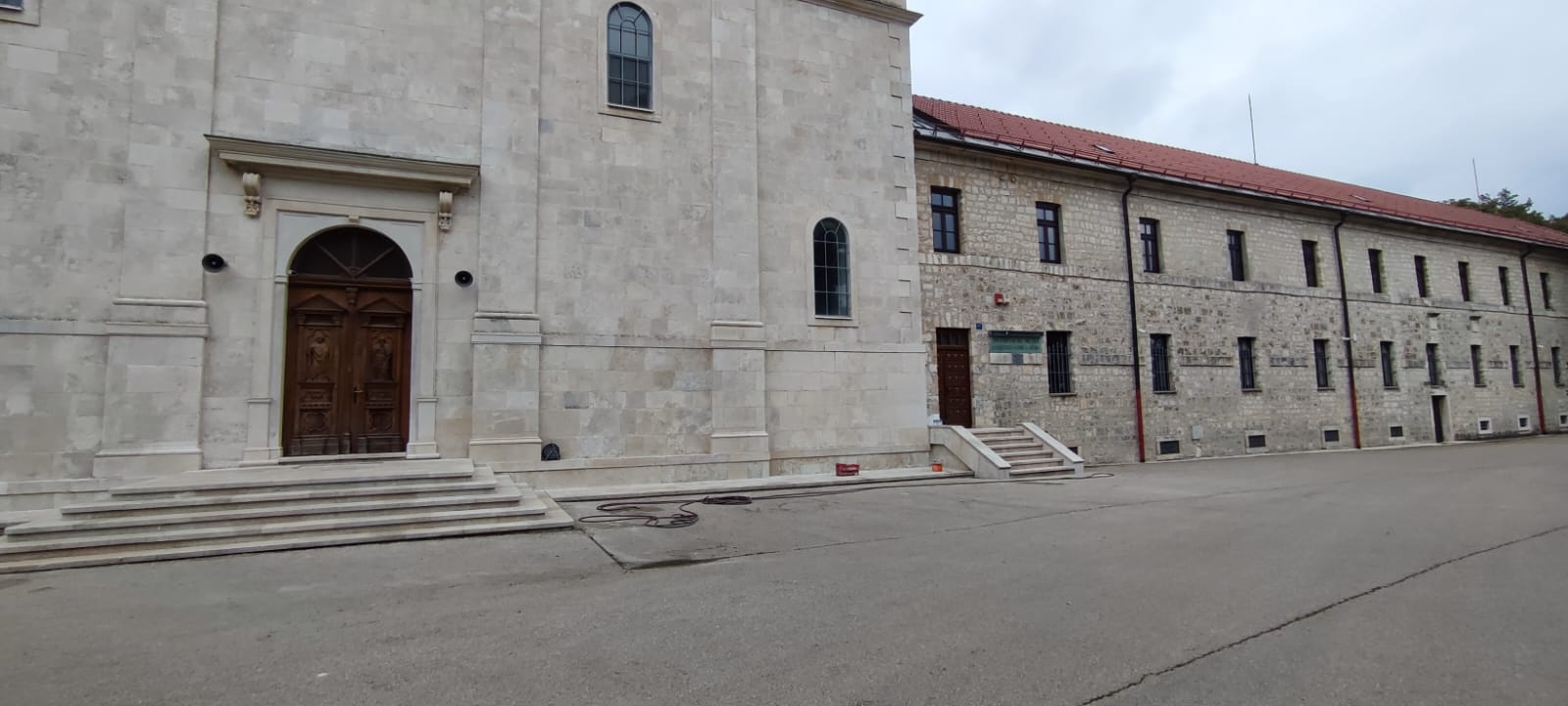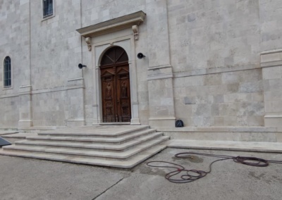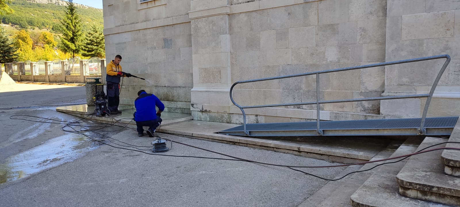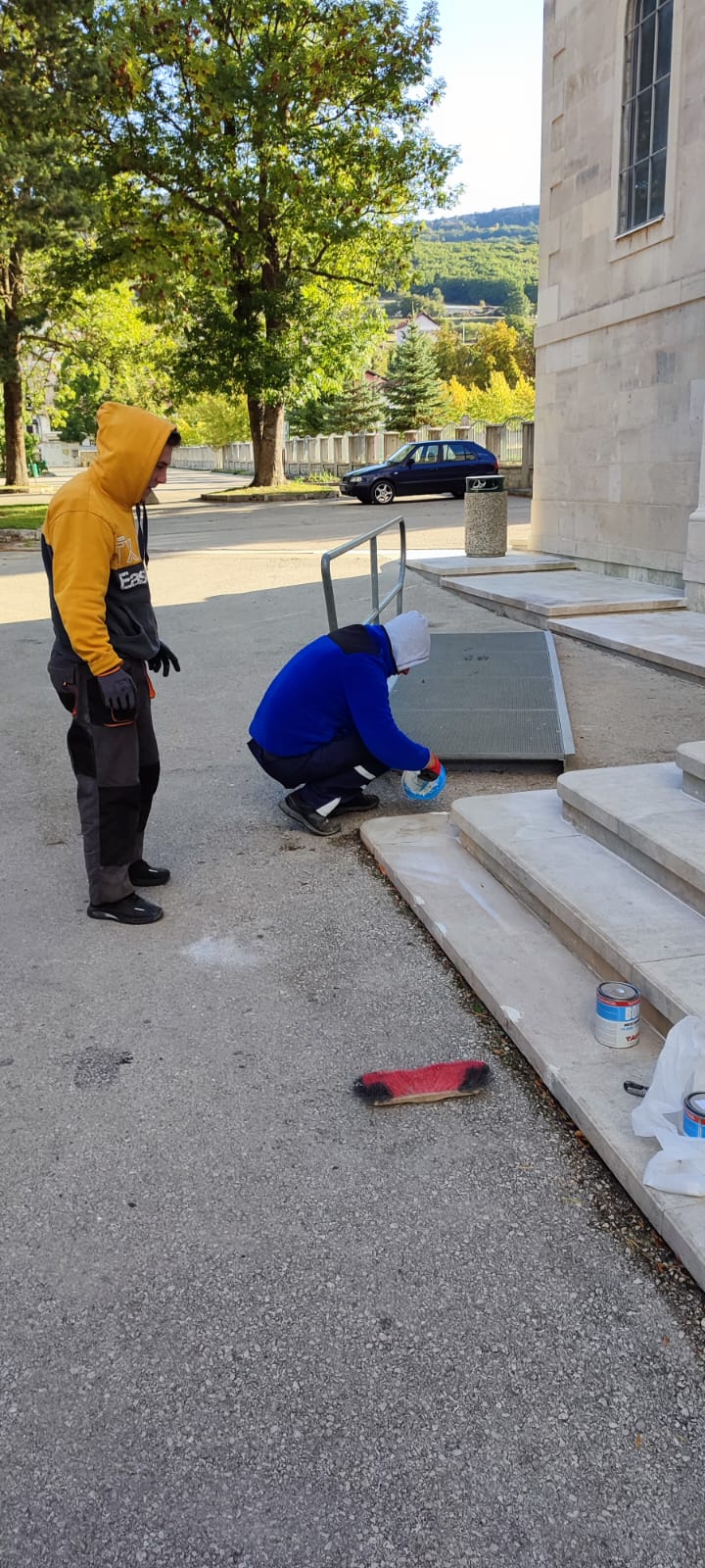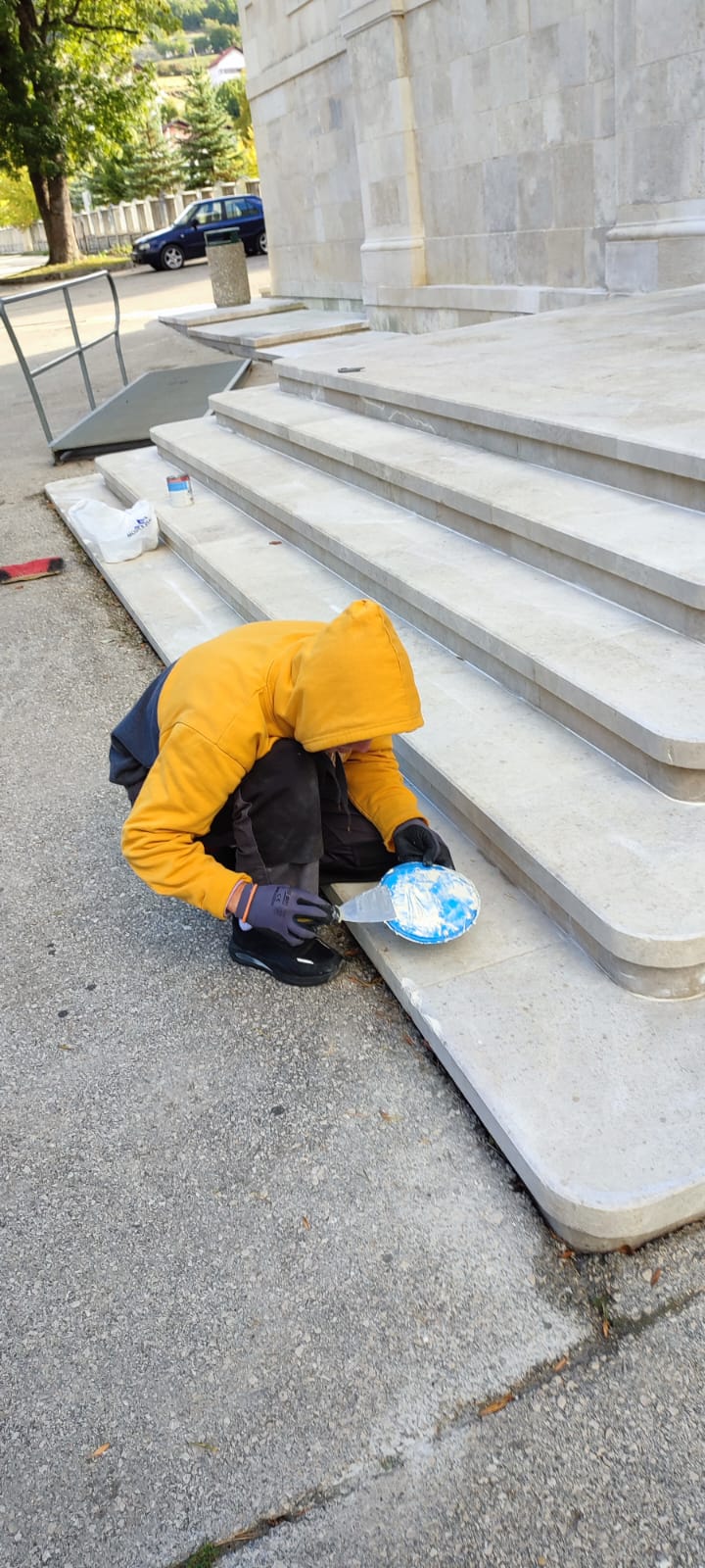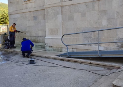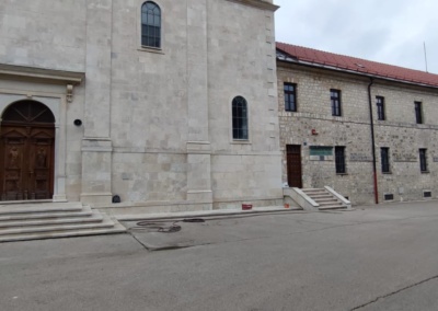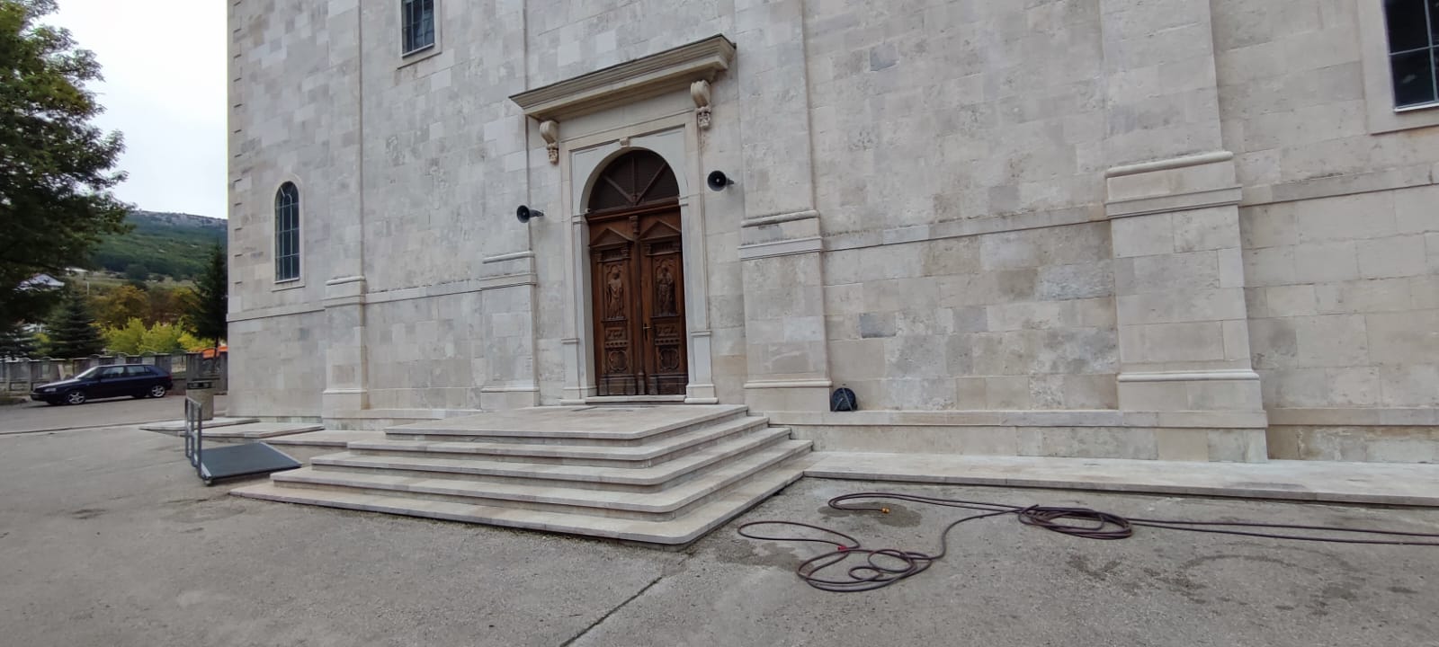 U sklopu ovih restauratorsko-konzervatorskih radova predviđeno je i uređenje kamenog stepeništa na crkvi, muzeju, kao i pročelja. Poslovi na ovom dijelu radova povjereni su poduzeću Magmat d.o.o. iz Jablanice. Njihovi radnici su već u ponedjeljak, 29. rujna, započeli sa strojno-ručnim čišćenjem i grundiranjem ulaznog podnog kamena ispred crkve, stepeništa i okolnih nogostupa kao i cokle. U sklopu svoga rada danas i sljedećih dana će načiniti i površinske popravke oštećenja na kamenu te očišćene površine zaštiti dvostrukim premazom koji smanjuje vodoupojnost kamena.