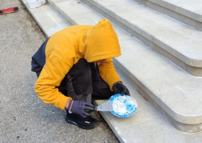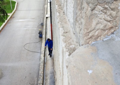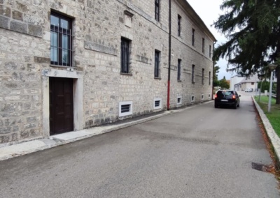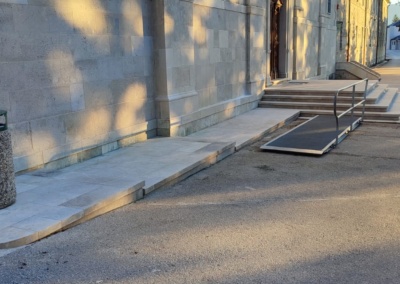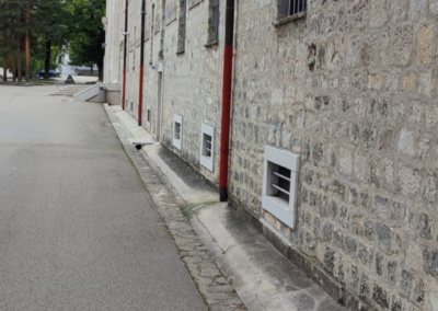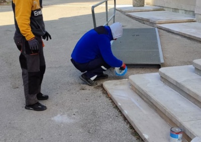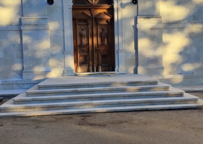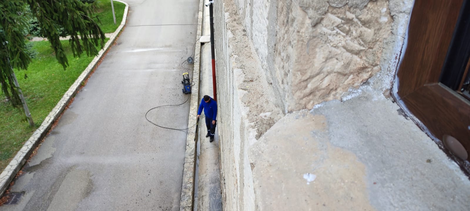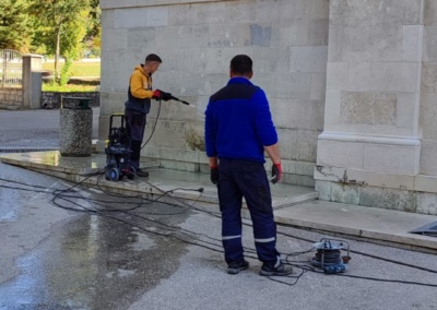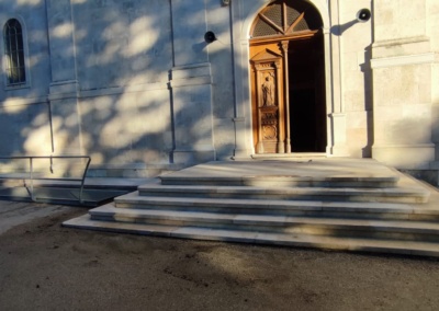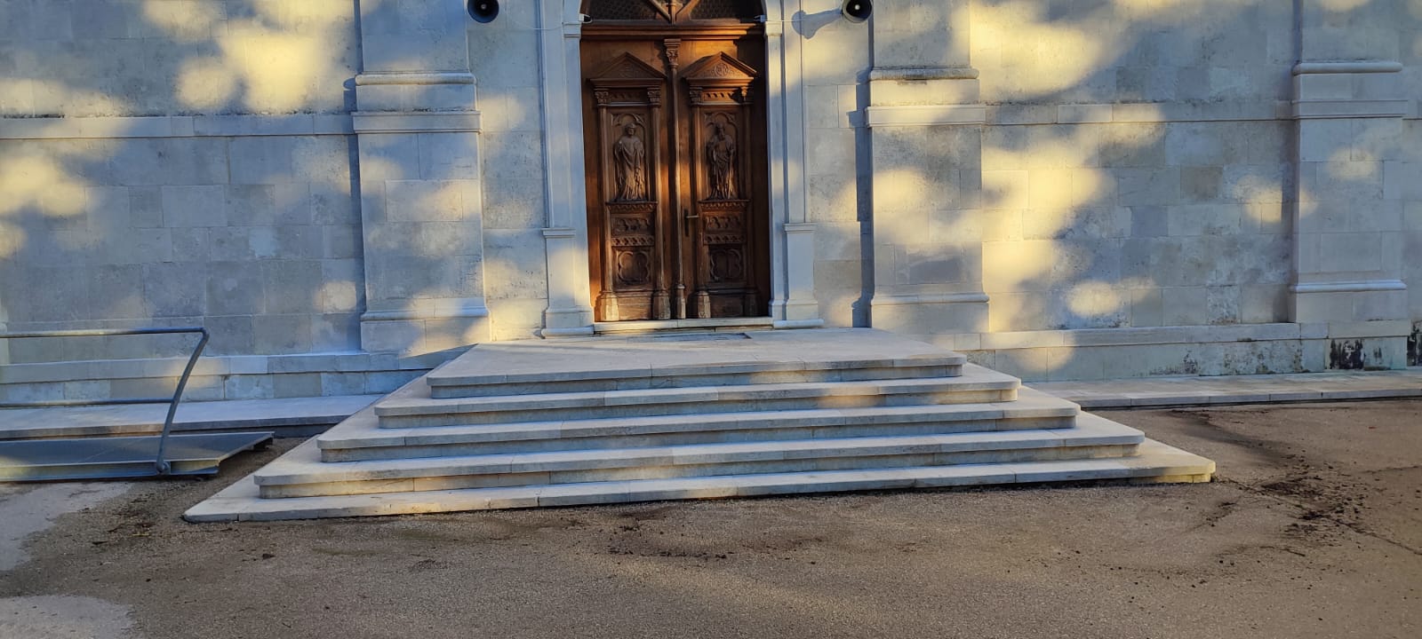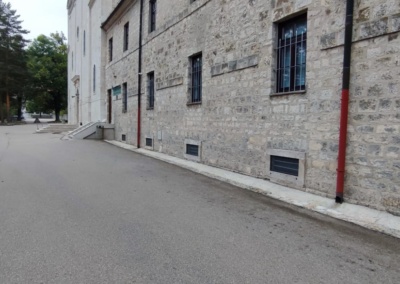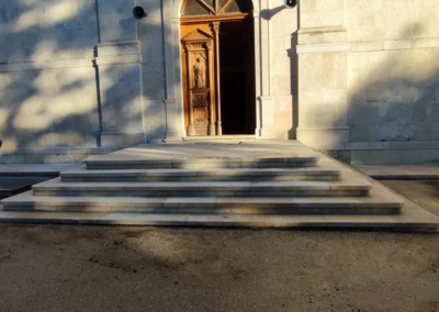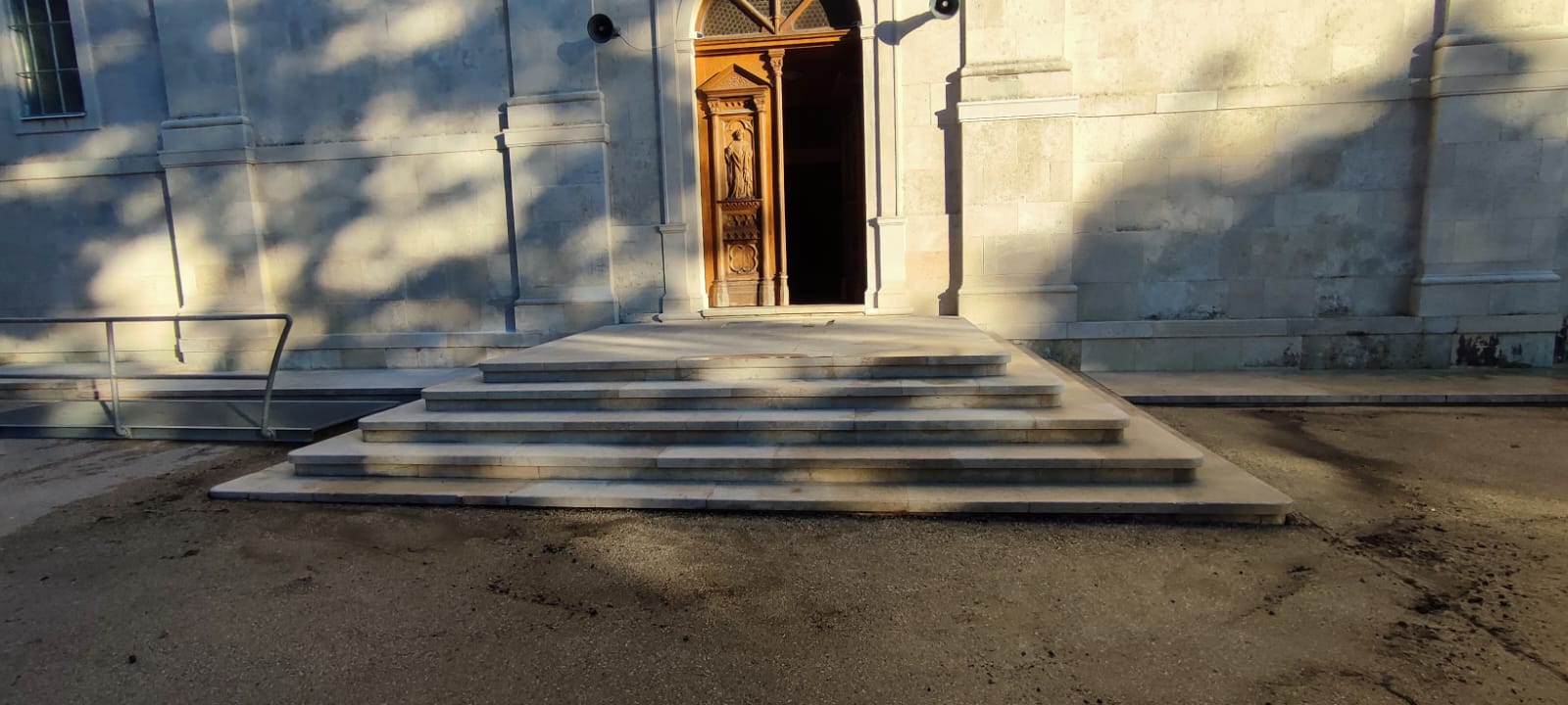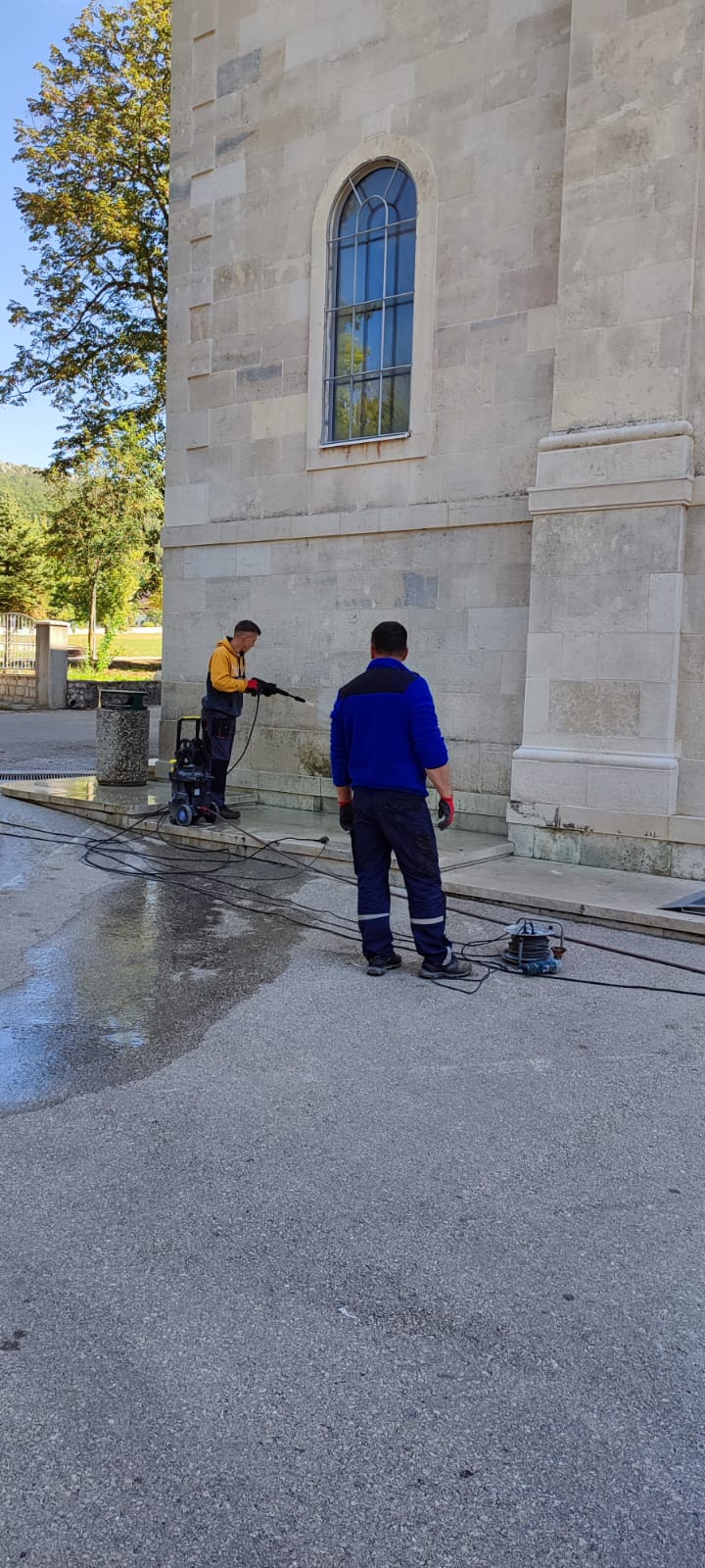 U sklopu ovih restauratorsko-konzervatorskih radova predviđeno je i uređenje kamenog stepeništa na crkvi, muzeju, kao i pročelja. Poslovi na ovom dijelu radova povjereni su poduzeću Magmat d.o.o. iz Jablanice. Njihovi radnici su već u ponedjeljak, 29. rujna, započeli sa strojno-ručnim čišćenjem i grundiranjem ulaznog podnog kamena ispred crkve, stepeništa i okolnih nogostupa kao i cokle. U sklopu svoga rada danas i sljedećih dana će načiniti i površinske popravke oštećenja na kamenu te očišćene površine zaštiti dvostrukim premazom koji smanjuje vodoupojnost kamena.